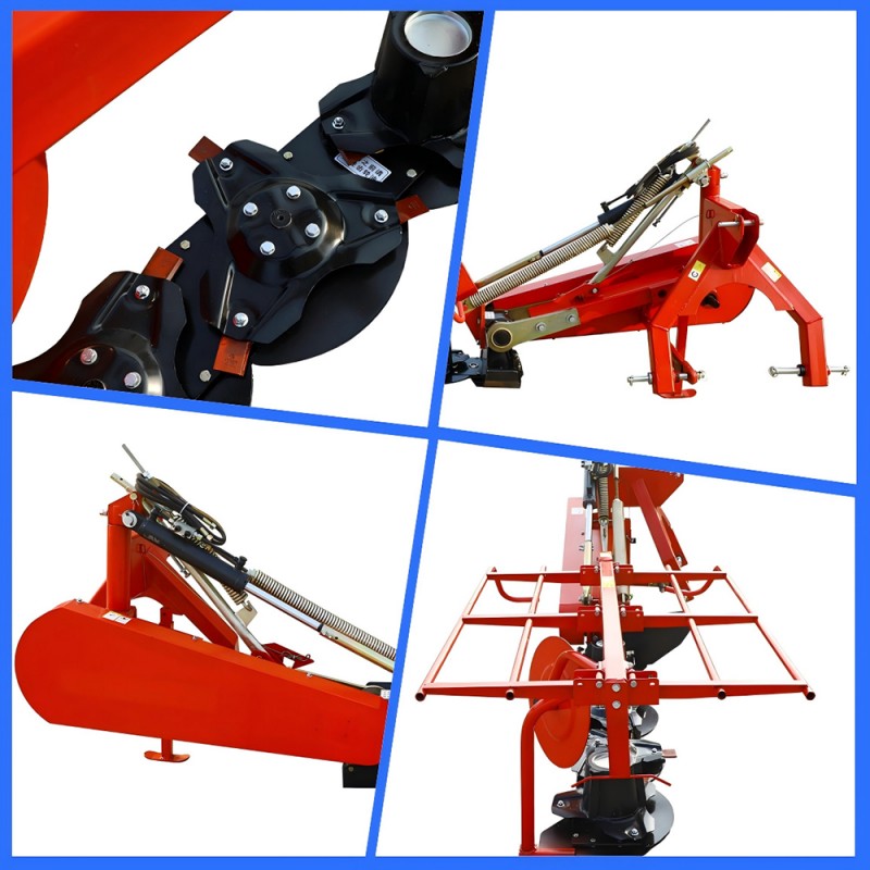 Skæremekanisme, hovedsageligt sammensat af flere diske. Hay Disc Mower er normalt udstyret med flere højhastighedsrotationsskiver, hver med 2-3 klinger. Bladene hænger sammen med diske, og når diske roterer i høj hastighed, opretholder knivene skæretilstand under handlingen af centrifugalkraft. Når man møder store hindringer, kan knivene skubbes tilbage for at undgå skader, og knivene kan bruges på den anden side, efter at den ene side af klingen er båret, hvilket er praktisk til udskiftning.